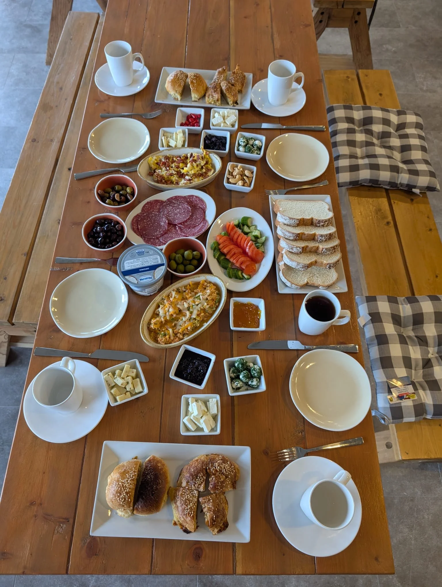 Cheese, Jams, Honey, Olives, Buns, Borek, Souse and menemen and Sucuk Eggs with endless Turkish tea. This is for min 2 person.
